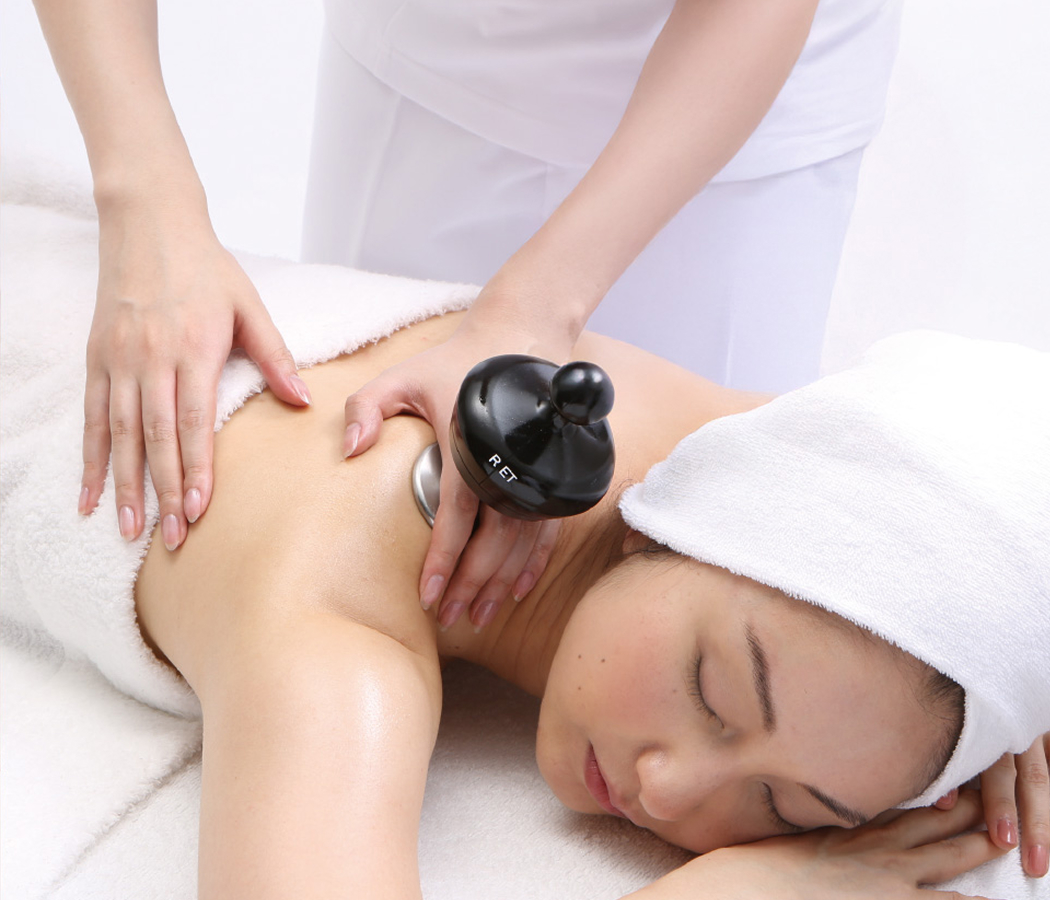 ラジオ波は、電極と対極板(アース)の間を行き来するエネルギーで、体内に“ジュール熱(摩擦熱)”を生じさせ、心地よい温かさを感じる温熱ケアです。表面を熱するだけでなく、深部からじんわり温まる体感が特長です。